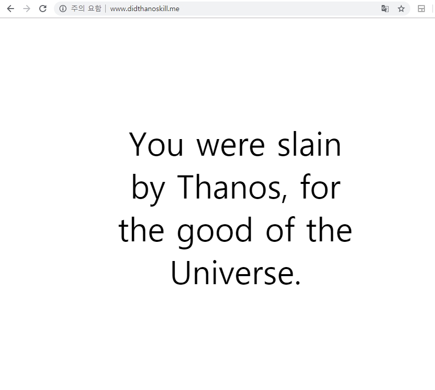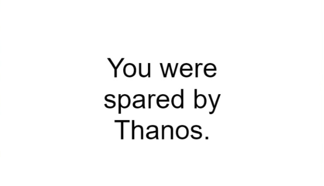 위와 같이 ‘You were spared by Thanos’라는 문장을 보게 되셨다면 축하드립니다! 여러분은 타노스의 핑거스냅에서 살아남으셨습니다!