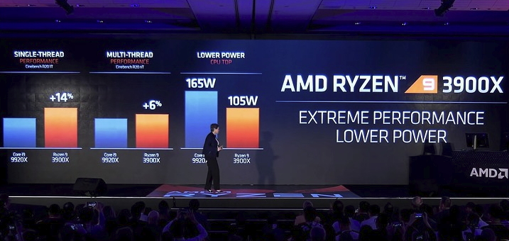 이와 동시에 발표에서 라이젠9 3900X는 동급인 인텔 i9의 9920X보다 훨씬 더 빠르나 그에 비해 전력소모는 훨씬 적다며 경쟁사인 인텔에 도전장을 던지기도 하였습니다.