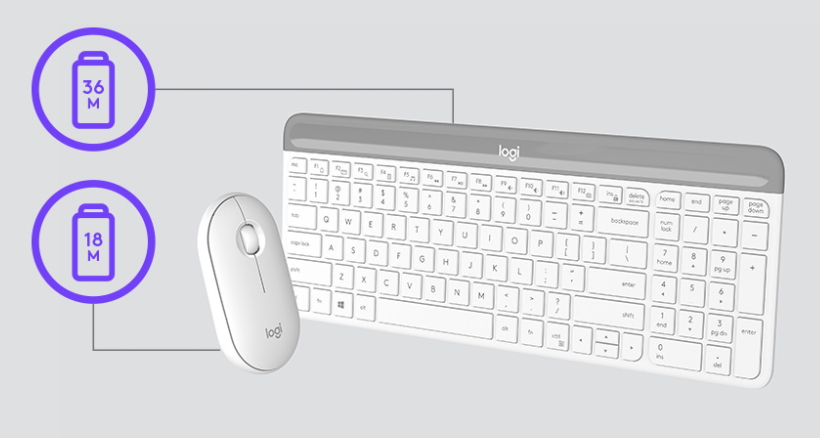 키보드와 마우스 둘 다 장시간 사용하지 않을 경우에는 슬립모드로 자동 변경되어 배터리 효율을 극대화 하였으며 키보드의 경우에는 36개월, 마우스는 18개월의 타 제품 대비 상대적으로 긴 배터리 수명을 가지고 있습니다.