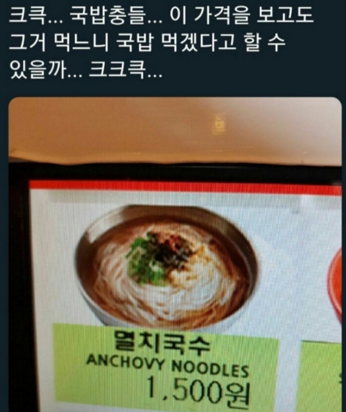 이에 다른 한 유저가 1,500원의 저렴한 국수를 올리며 지원사격을 했으나, 1,500원짜리 선지국밥이 등장하며 해당 논란은 종식되었습니다.